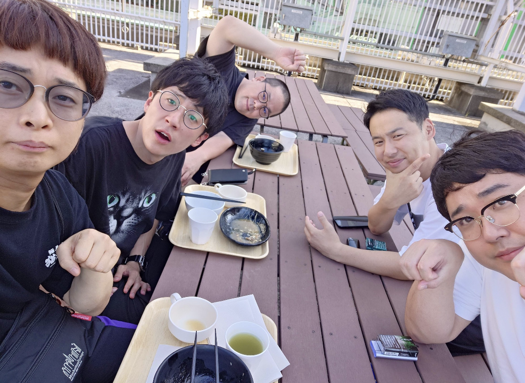 これは出番合間に、ルミネビル社員食堂の屋外スペースでランチタイムと洒落込んでいる芸人たちだ。