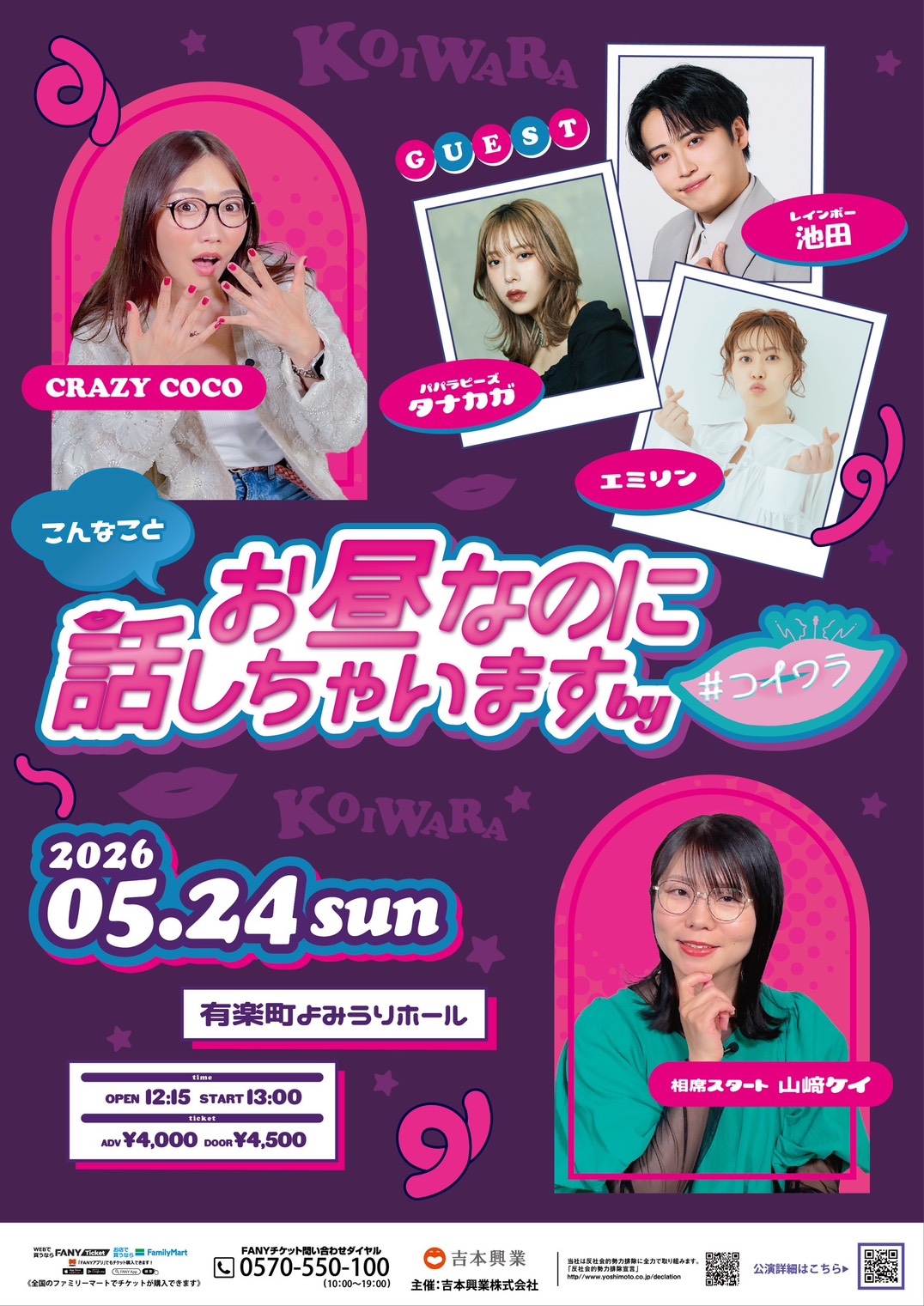 5月24日(日)に有楽町よみうりホールで開催される、YouTubeチャンネル『#コイワラ【芸人×恋愛】』のイベント『お昼なのにこんなこと話しちゃいます by #コイワラ』に、レインボー・池田直人の追加出演が決定しました。